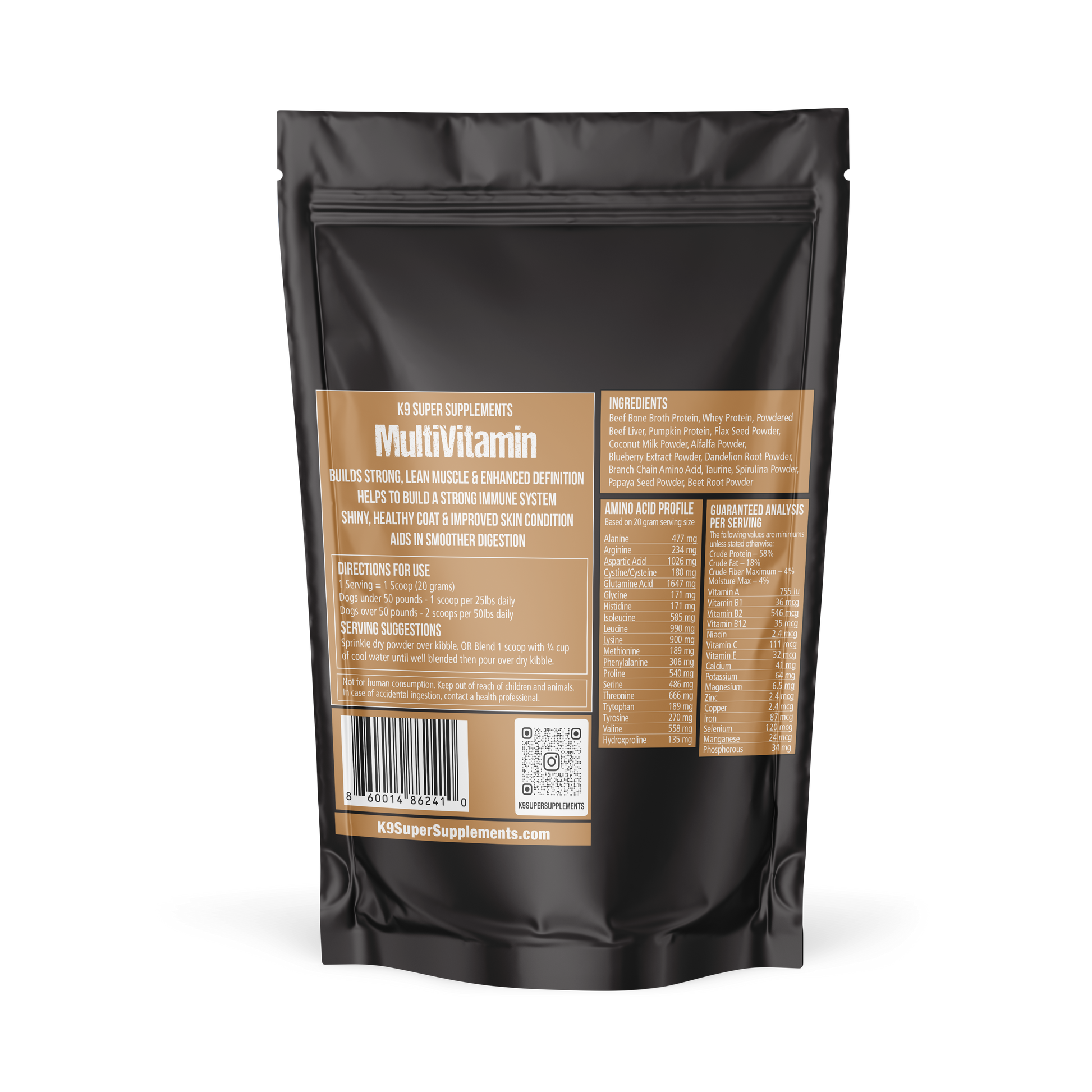 Specially formulated to mimic a raw diet, K9 Multivitamin includes powerful, nutrient-dense ingredients like beef broth protein, organic pumpkin protein, coconut milk powder, organic alfalfa, blueberry extract, flax seed, dandelion root, and beetroot.